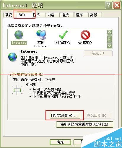 2、在打开的窗口中切换到“安全”选项卡,单击“自定义级别”;