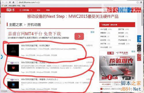 4、下面就开始查找“IT之家”的网址(安装魔方的时候自带快捷方式),出现如下画面,接着请点击箭头所指处,输入“开机动画”(图1)。选择第一个(图2),接着你就会看到开机动画的文件了(红圈所圈处)。
