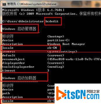 2、在打开的命令提示符窗口中输入“bcdedit”,然后检查下Windows启动管理器和Windows启动加载器下locale对应的语言是否与Windows 7系统语言一致,zh-CN”代表中文版;
