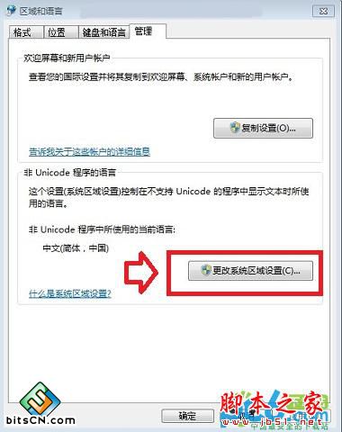 四、接下来会弹出“区域和语言”属性对话框,然后再顶部切换到“管理选项”,然后再点击底部的“更改系统区域设置”,如下图所示: