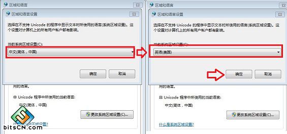五、最后,我们将默认的系统区域设置,由“中文(简体,中国)更改为“英语(美国)”即可,完成后,一路点击底部的确定即可完成电脑语言改为英文了,如下图所示: