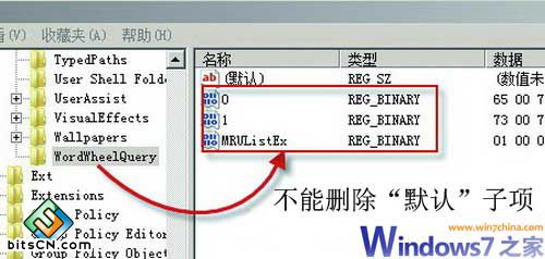 还是需要在注册表中来进行操作,在开始菜单的搜索栏中输入“regedit”进入注册表,依次找到如下键值:HKEY_CURRENT_USERSoftwareMicrosoftWindowsCurrentVersionExplorerWordWheelQuery,删除右边子项中除了名为默认的项即可。如果怕删错可以先选择上方工具栏的“导出”功能来备份注册表,有问题时再恢复即可。