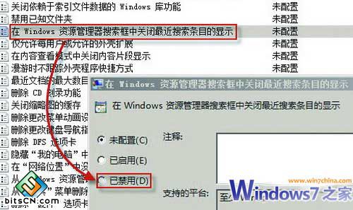 第二步:打开“用户配置→管理模板→Windows组件→Windows资源管理器”,选择右侧窗格中的“在Windows资源管理器搜索框中关闭最近搜索条目的显示”项目,双击该项目打开属性窗口,在这里选择“已启用”,最后单击“确定”即可启用该功能,这样以后就不会自动保存搜索记录了。