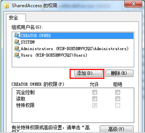 右键SharedAccess选择“权限”,在打开的“SharedAccess权限”窗口中,单击“添加”。