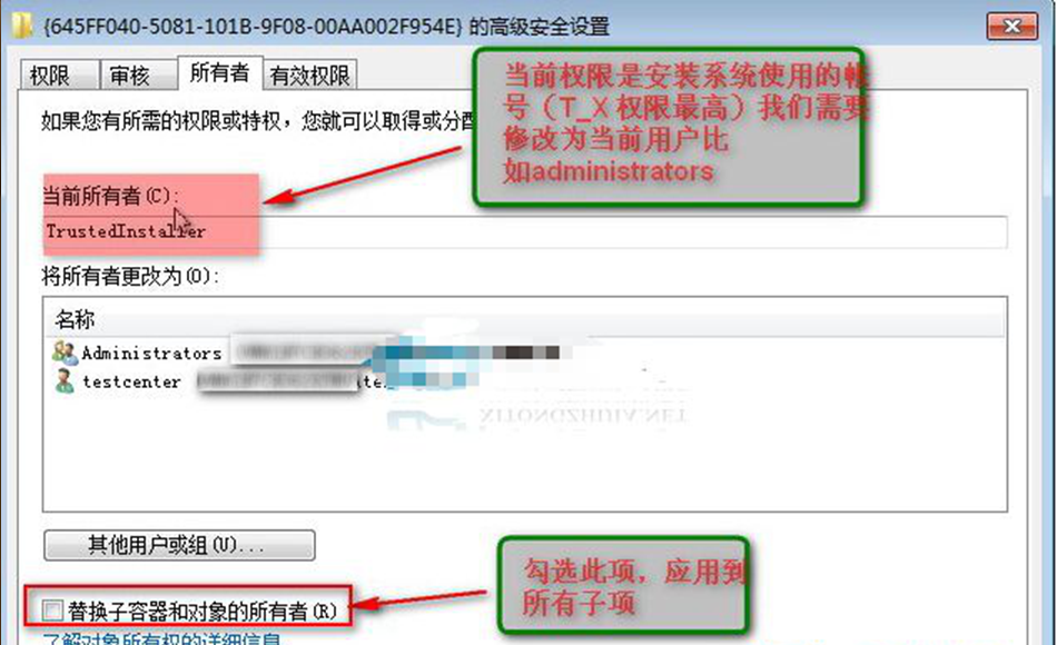 3、在打开的高级安全设置窗口,切换到“所有者”标签页,此时可看到所有者是“TrusteInstaller”这是一个Windows内部管理员帐户,它权限非常高,而我们需要将把所有者更改为当前登录帐户,比如Administrator,点击选择所有者更改为administrators,同时勾选替换子容器和对象的所有者(相当于把该注册表项下的子项都更改成当前所有者);