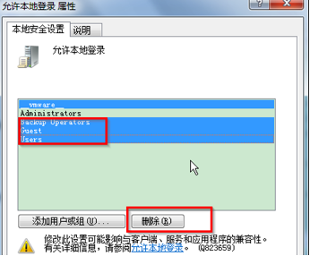 3、弹出“允许本地登录属性”窗口,只保留“Administrators”用户,其余的用户删除掉。